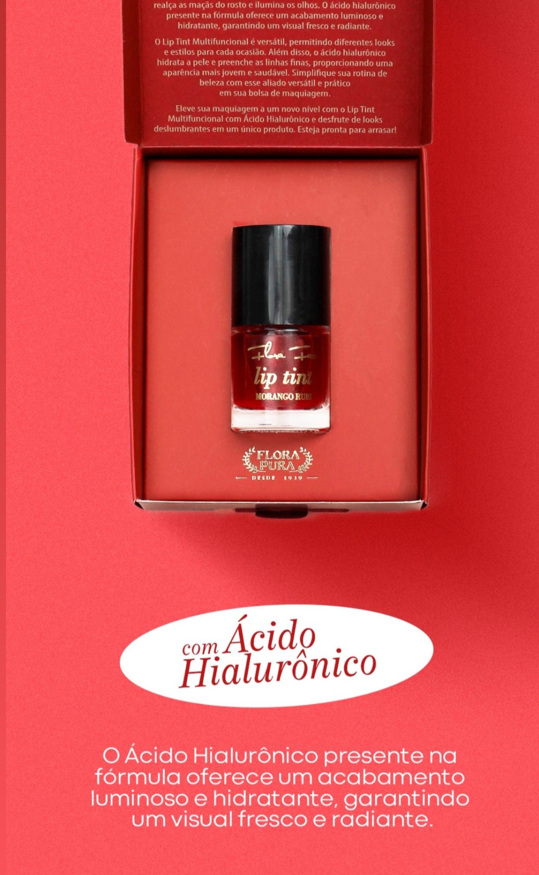 O Lip Tint Morango Rubi da Flora Pura une cor e hidratação, com ácido hialurônico para deixar os lábios macios e confortáveis. Sua textura leve e versátil permite uso nos lábios, como blush nas bochechas ou até sombra nas pálpebras — ideal para looks naturais do dia a dia. O acabamento luminoso realça a pele com suavidade e frescor, perfeito para quem busca praticidade e beleza discreta.